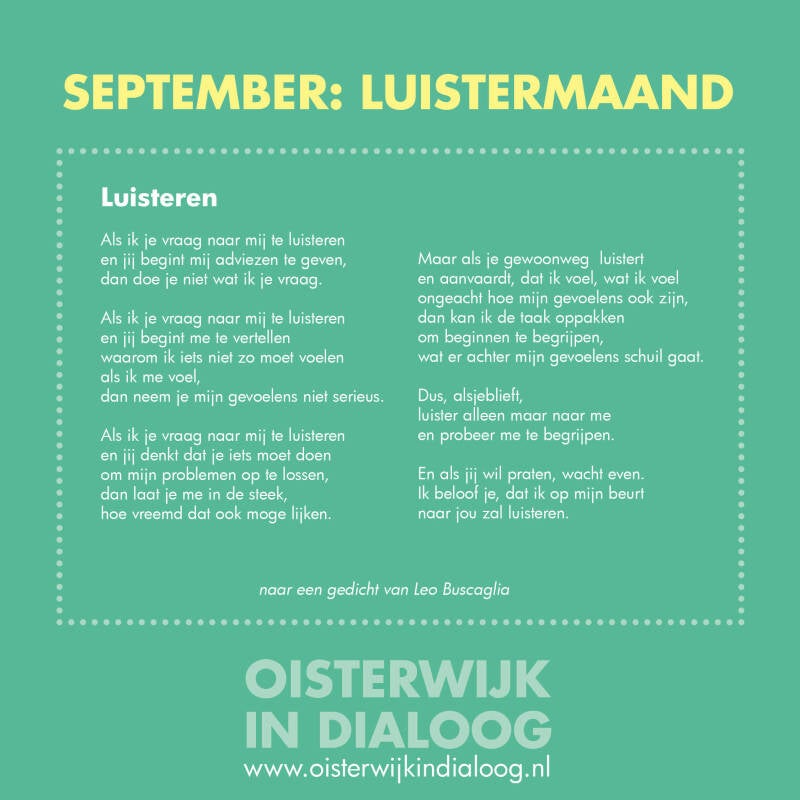 Deze maand is het Luistermaand en vandaag is het Internationale Dag van het Luisteren. Een mooie gelegenheid om wat vaker bewust te kiezen voor het luisteren naar een ander! www.oisterwijkindialoog.nl