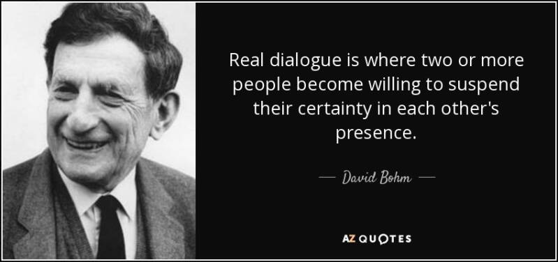 - Bohm stelt dat 'we altijd in dialoog moeten gaan om ons denken goed te doorgronden'.